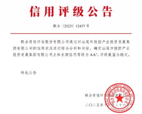 再创佳绩!汕尾bwin必赢国际下属产发集团喜获“AA+”主体信用评级